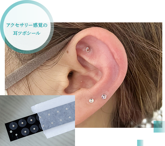 耳ツボジュエリーはシールの裏にチタン製の小さなボールがあり、そのチタンボールが耳ツボを刺激します。